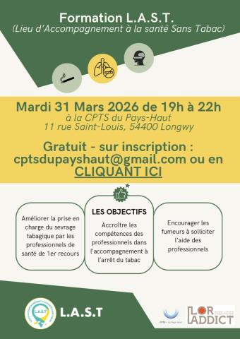 📢 Formation LAST – Lieu d’Accompagnement à la Santé sans Tabac La CPTS Porte de France Moselle, en collaboration avec Grand Est Addictions, organise une formation LAST, dédiée à l’accompagnement des patients fumeurs. 🗓 Samedi 21 mars 2026 🕘 9h – 12h 📍 7 rue Fabert, 57600 Forbach