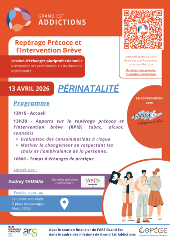 📢 Session de sensibilisation au RPIB – Périnatalité 👉 Dans le cadre du partenariat entre Grand Est Addictions et la Coordination Périnatale Grand Est (DSR-P COPEGE), une session d’échanges pluriprofessionnelle est proposée aux professionnel·le·s du champ de la périnatalité (Sage-femme, Gynécologue-obstétricienne, Pédiatre, Puéricultrice, etc…) autour du Repérage Précoce et de l’Intervention Brève…