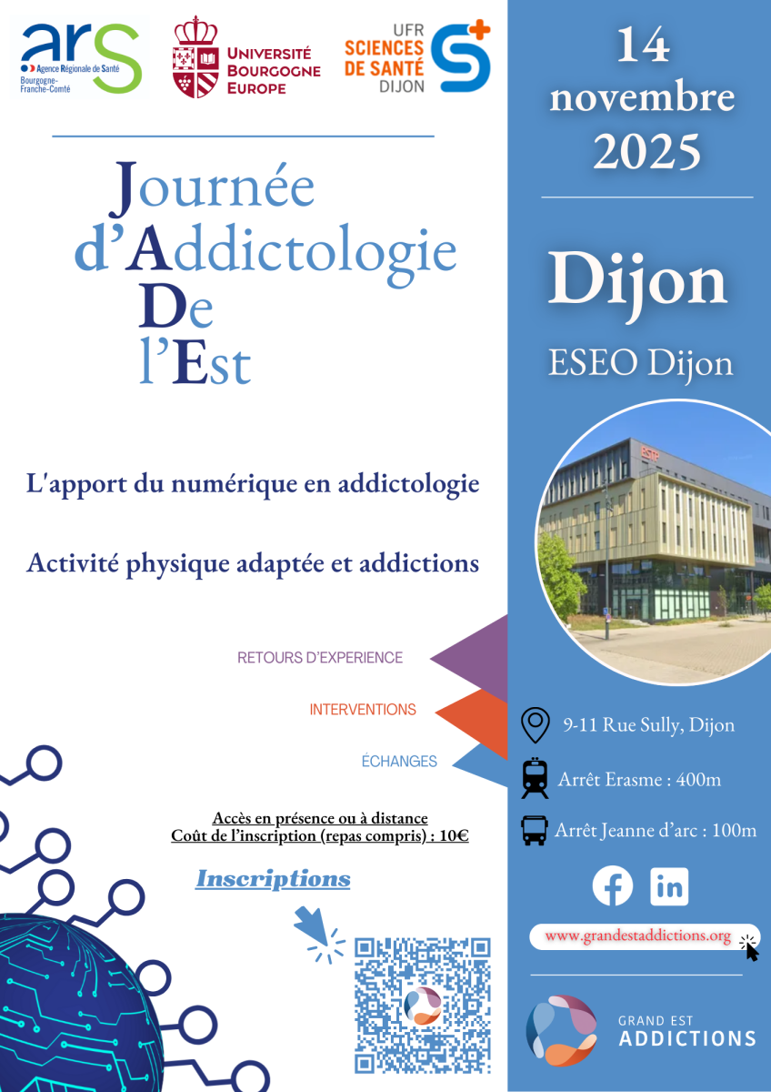 Grand Est Addictions organise la "Journée Addictologie De l'Est" (JADE), le rassemblement de la communauté addictologique du Grand Est et Bourgogne Franche-Comté le 14 novembre 2025 à Dijon.