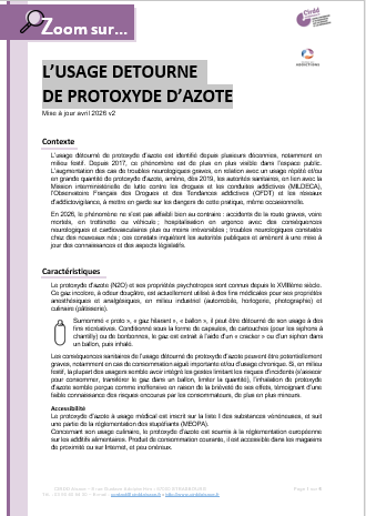 L’usage détourné et l’abus de protoxyde d’azote (sous forme de cartouches ou de bonbonnes insufflées dans des ballons de baudruche) est en forte augmentation depuis plusieurs années, en particulier chez les jeunes adultes. Il est peu associé à d’autres consommations. Les effets recherchés sont notamment : hilarité, euphorie, désinhibition, mais aussi anxiolyse, « défonce ».