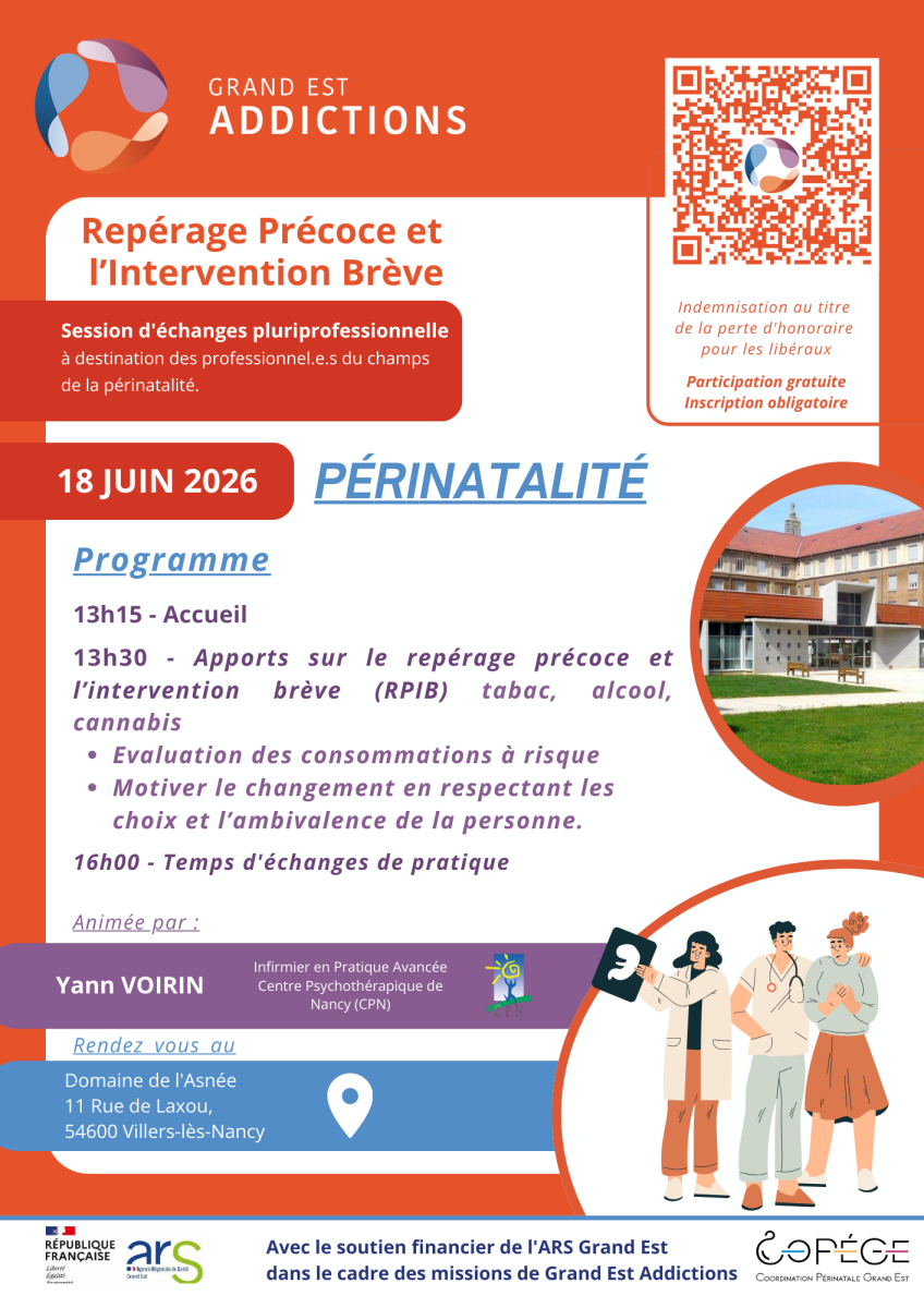 👉 Dans le cadre des actions de Grand Est Addictions, une session d’échanges pluriprofessionnelle est proposée aux professionnel·le·s du champ de la périnatalité (Sage-femme, Gynécologue-obstétricien, Pédiatre, Puéricultrice. Ostéopathe périnatal, etc…) autour du Repérage Précoce et de l’Intervention Brève (RPIB) sur les consommations de tabac, alcool et cannabis.